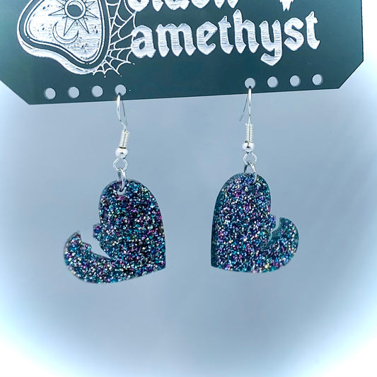 Holo Black Glitter Broken Heart Earrings